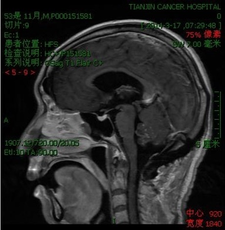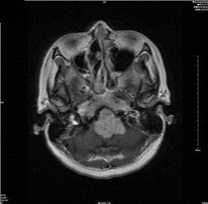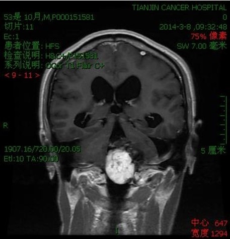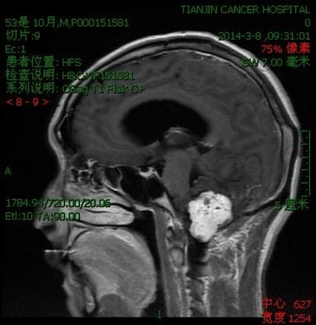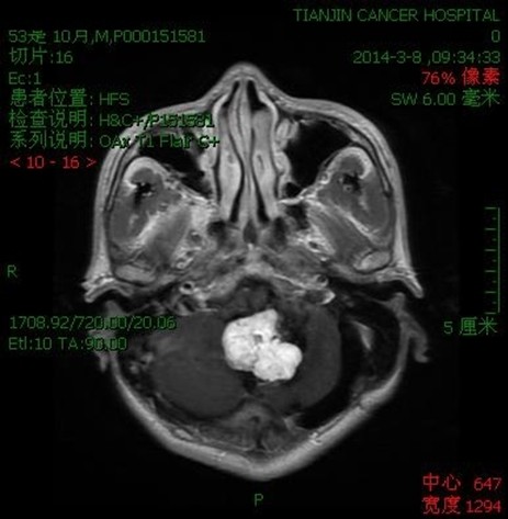 病例二:王**,男性,53岁。因做小脑肿瘤术后9年,头痛头晕,伴颈部疼痛、走路不稳半年入院。入院诊断:延颈交界血管网织细胞瘤。术式:后正中入路延颈交界区血管网织细胞瘤切除术。术后病理:血管网织细胞瘤。术后头痛头晕,颈部疼痛消失,走路平稳。