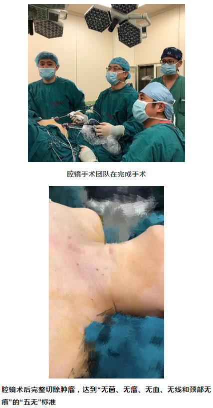患者术后恢复良好,远期吞咽不适、声音嘶哑等常见并发症均低于开放手术,随后开展了腔镜下经全乳晕入路巨大甲状腺肿瘤切除术、甲状腺癌根治术等。