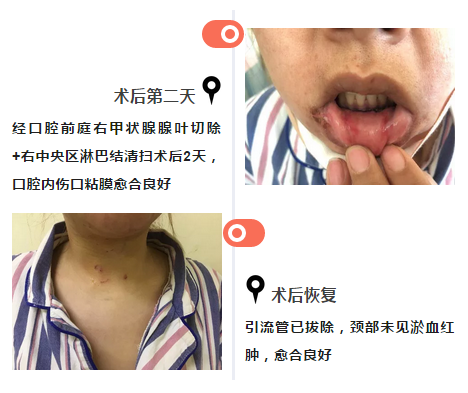 近期我科又成功开展了经口腔前庭甲状腺癌根治术,此术式经过人体的自然腔隙完成甲状腺手术,创伤更小,术后伤口粘膜愈合,真正达到无痕要求,对瘢痕体质患者尤为适用。同时在甲状腺微创手术护理方面也积累了较丰富经验,从术期准备、术后监护到出院后颈部功能锻炼等方面全程指导患者尽快康复。