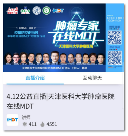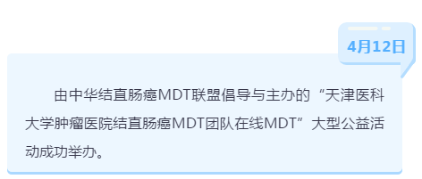 受疫情影响,团队近期MDT工作由线下转为线上,竭尽所能为广大患者缓解疫情期间就医难题。正值全国肿瘤防治宣传周,团队受邀参与大型公益活动“中华结直肠癌MDT联盟在行动(第九场)”。