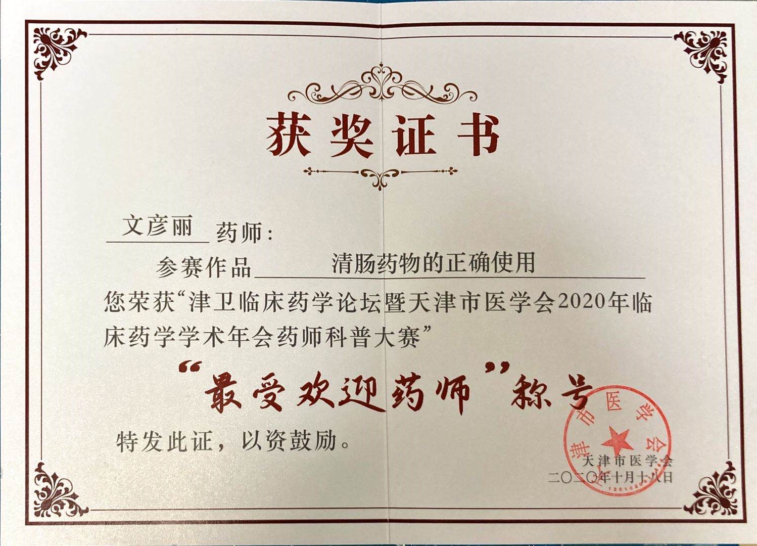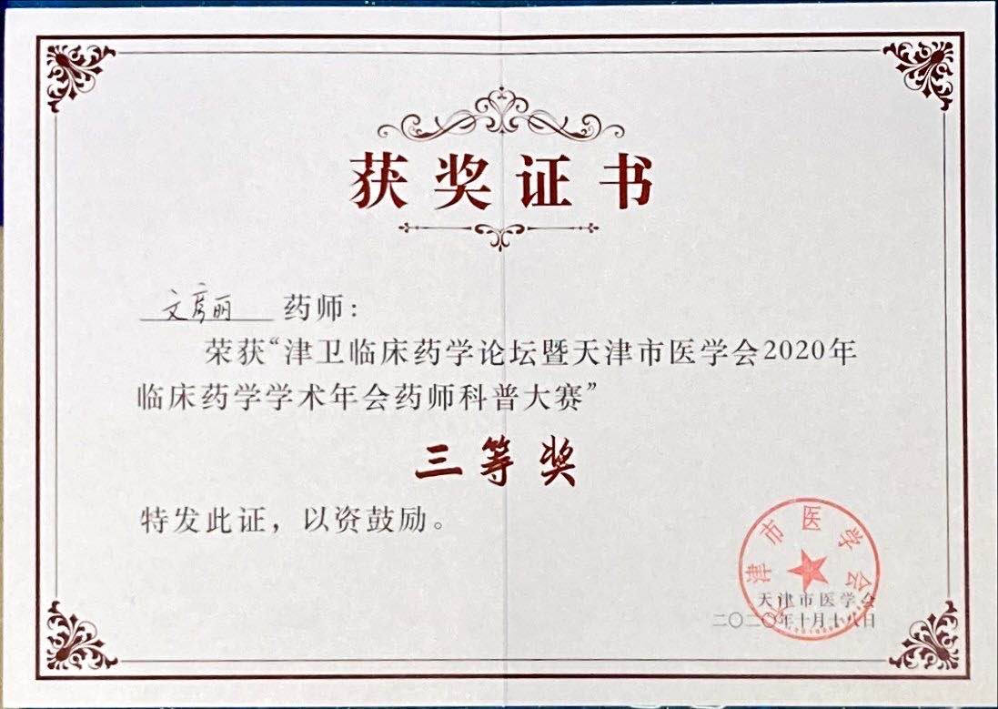| 为落实《“健康中国2030”规划纲要》的方针策略,推进健康中国建设,加强互联网医疗健康科普知识创作与传播的规范化、标准化,鼓励药师以新媒体方式参与全民健康教育,让药师走入大众视野,普及安全用药知识,由天津市医学会与北京医学奖励基金会共同主办,天津市医学会临床药学分会承办的“津卫临床药学论坛暨天津市医学会2020年临床药学学术年会”于2020年10月18日召开,并在同期举办了药师科普演讲大赛。经专家评委打分选拔,药学部文彦丽药师在初赛中脱颖而出,并在决赛中荣获本次科普演讲比赛三等奖和“最受欢迎药师”荣誉称号。