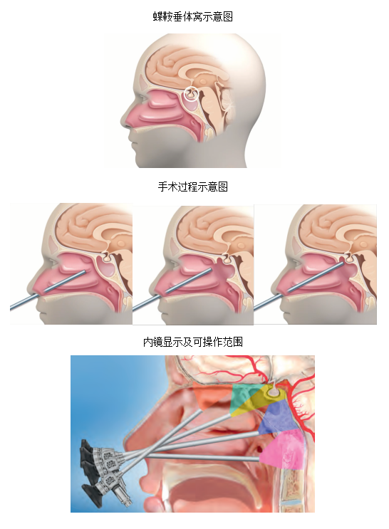 经鼻内镜手术原为耳鼻喉科用来治疗鼻腔副鼻窦疾病的常用手段。现在被神经外科医师所用,取代传统的显微神经外科手术。使用神经内镜通过鼻腔,打开蝶窦,筛窦、进一步磨除斜坡骨质等结构,可以对鼻腔、副鼻窦、前颅窝底、鞍区、斜坡、枕骨大孔区肿瘤进行手术治疗。相比显微神经外科手术,具有对病灶抵近观察,照明好,显露充分,死角少,肿瘤切除率高,对正常结构破坏小,术后恢复快等优点。