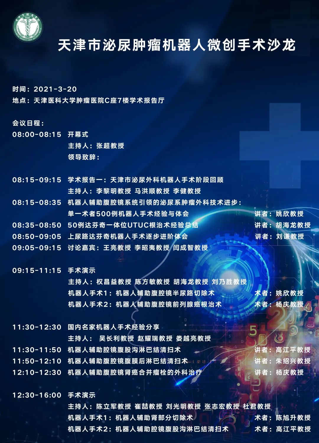 为了推动天津市泌尿肿瘤机器人手术水平,天津医科大学肿瘤医院与天津市抗癌协会泌尿男生殖系肿瘤专业委员主办的天津市泌尿肿瘤机器人微创手术沙龙将于2021年3月20日上午8点在天津医科大学肿瘤医院C座7楼学术报告厅举行。