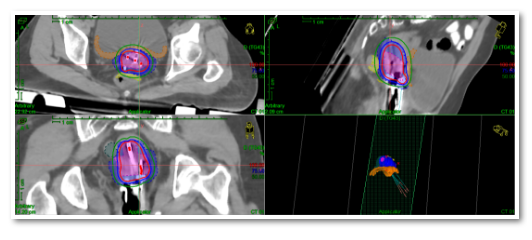 在完成前期准备后,陈杰主任团队将插植针置入患者宫腔,通过放疗专用CT、MR扫描确认并调整插植针的位置,利用三维后装放疗计划系统进行靶区和正常器官的勾画,快速制定放疗计划,精准实施近距离放疗,顺利完成治疗。