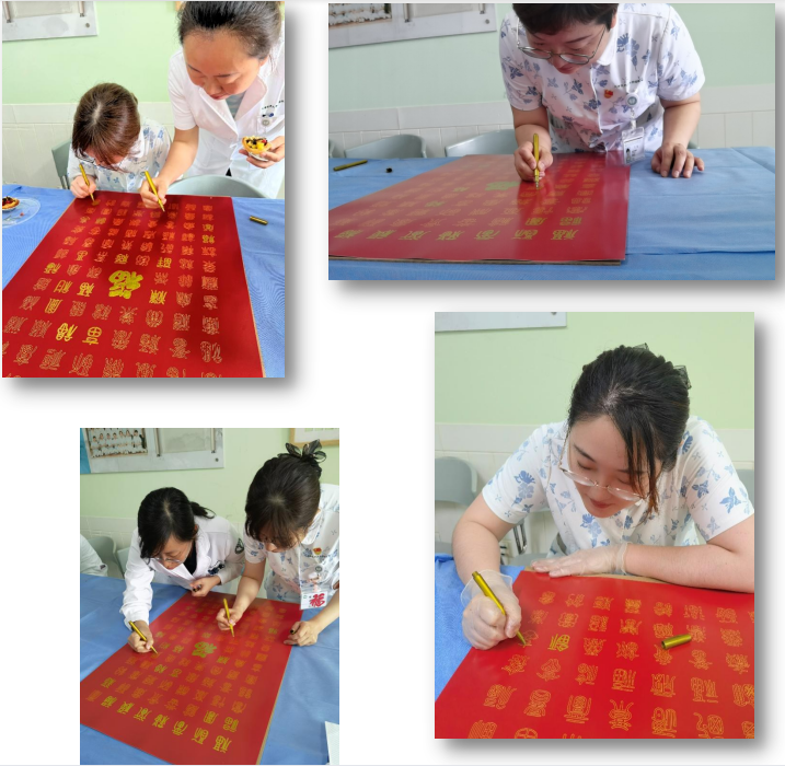 李雅楠老师组织大家庭的每一位医护人员用金色的颜料笔齐心描绘《百福图》。福者,备也;备者,百顺之名也;无所不顺者谓之备。言内尽于己,而外顺于道也。百福图百体并举,美不胜收,聚心斋小家家长任秀宝主任勇挑重担绘制最大“福”字,祝福大家百福纳祥,万事顺意。