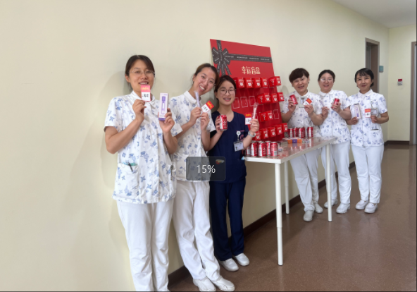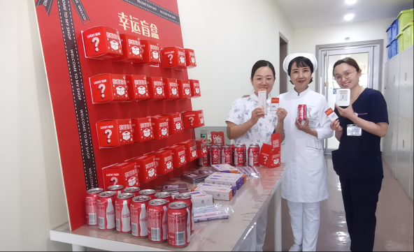 护士长带领骨干护士精心设计“显眼包趣味”游戏,既融合了护士眼疾手快的日常工作能力,又充满趣味性。护士们分组协作,在竞技中展现智慧与默契,现场笑声、欢呼声不断。每轮游戏的获胜者可参与“幸运盲盒”抽奖,盲盒内藏有科室准备的贴心祝福小礼物。此外,每位参赛者均获赠可口可乐特制的护士节纪念瓶,瓶身印有专属姓名与祝福语,成为一份独特的节日珍藏。