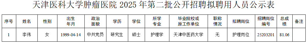 附:天津医科大学肿瘤医院2025年第二批公开招聘拟聘用人员公示表
