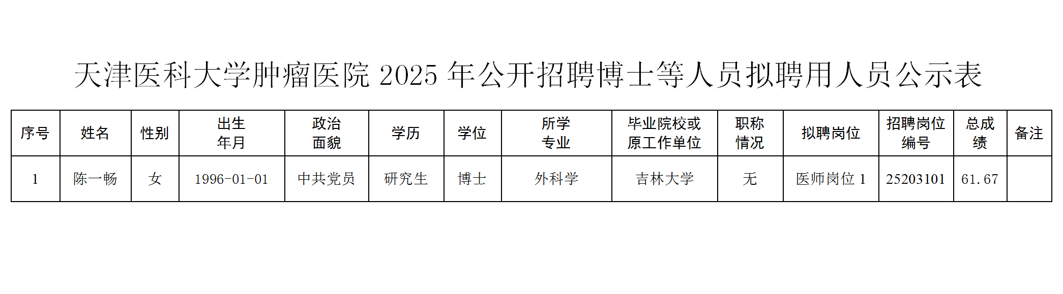 附:天津医科大学肿瘤医院2025年公开招聘博士等人员拟聘用人员公示表